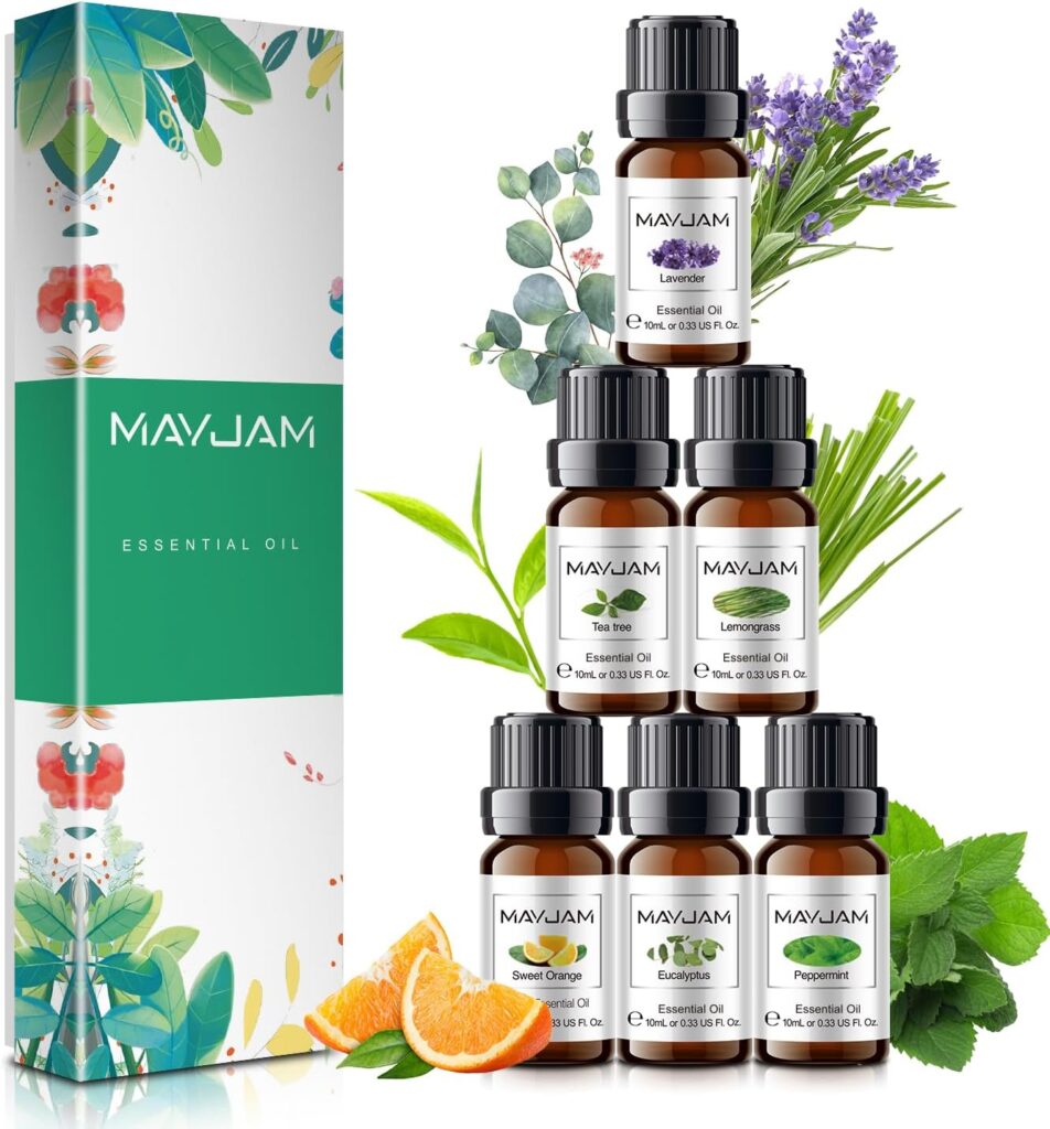 MAYJAM Set Aceites Esenciales Naturales Puros 6 x 10ml, Aceites Esenciales para Humidificador Difusor, Aceite Esencial de Eucalipto, Lavanda, Menta, Tee Tree, Naranja Dulce, Citronela