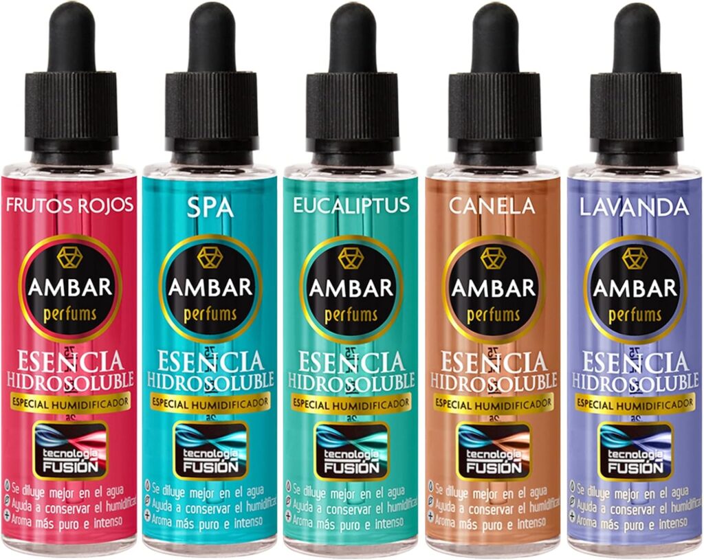 Juego 5 Esencias Hidrosolubles de 50 ml, bienestar natural. Tamaño XL. Tecnología Fusión para Humidificador. Aromas Canela, Eucalipto, Frutos Rojos, Lavanda, Spa.
