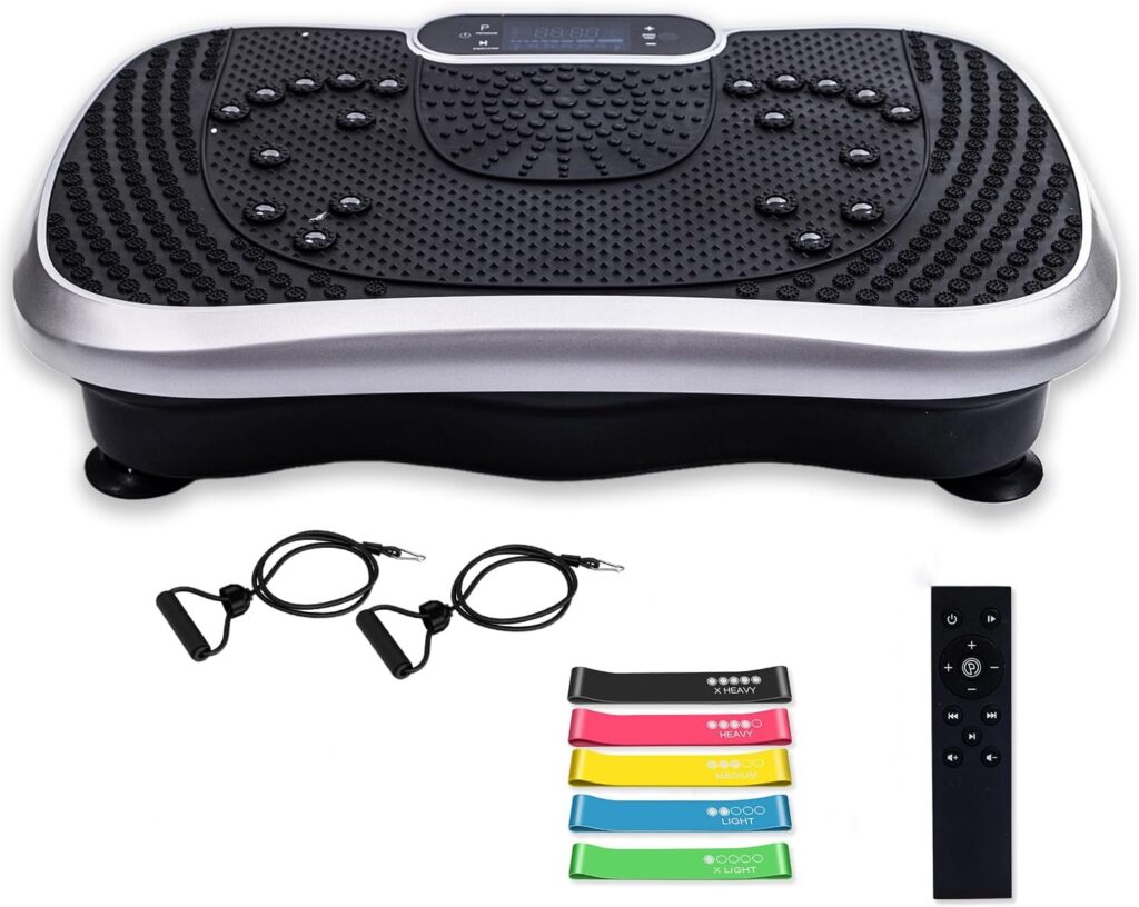 Plataforma Vibratoria – 99 Velocidades, Masajeador, Altavoz Bluetooth y Bandas Elásticas – Plataforma Vibración Muscular para Hacer Ejercicio en Casa con Mando a Distancia y 5 Programas