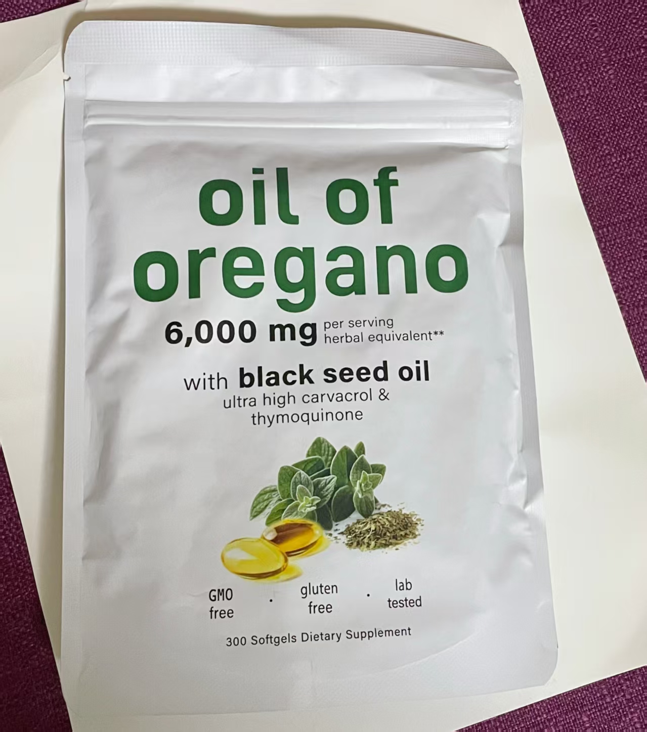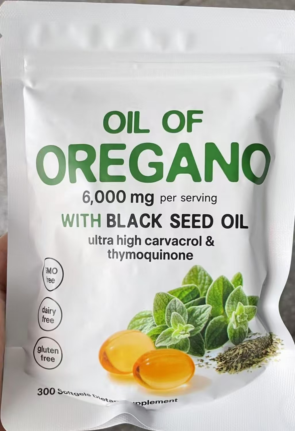 Aceite de orégano concentrado (6.000 mg por ración equivalente herbal según indica el envase).