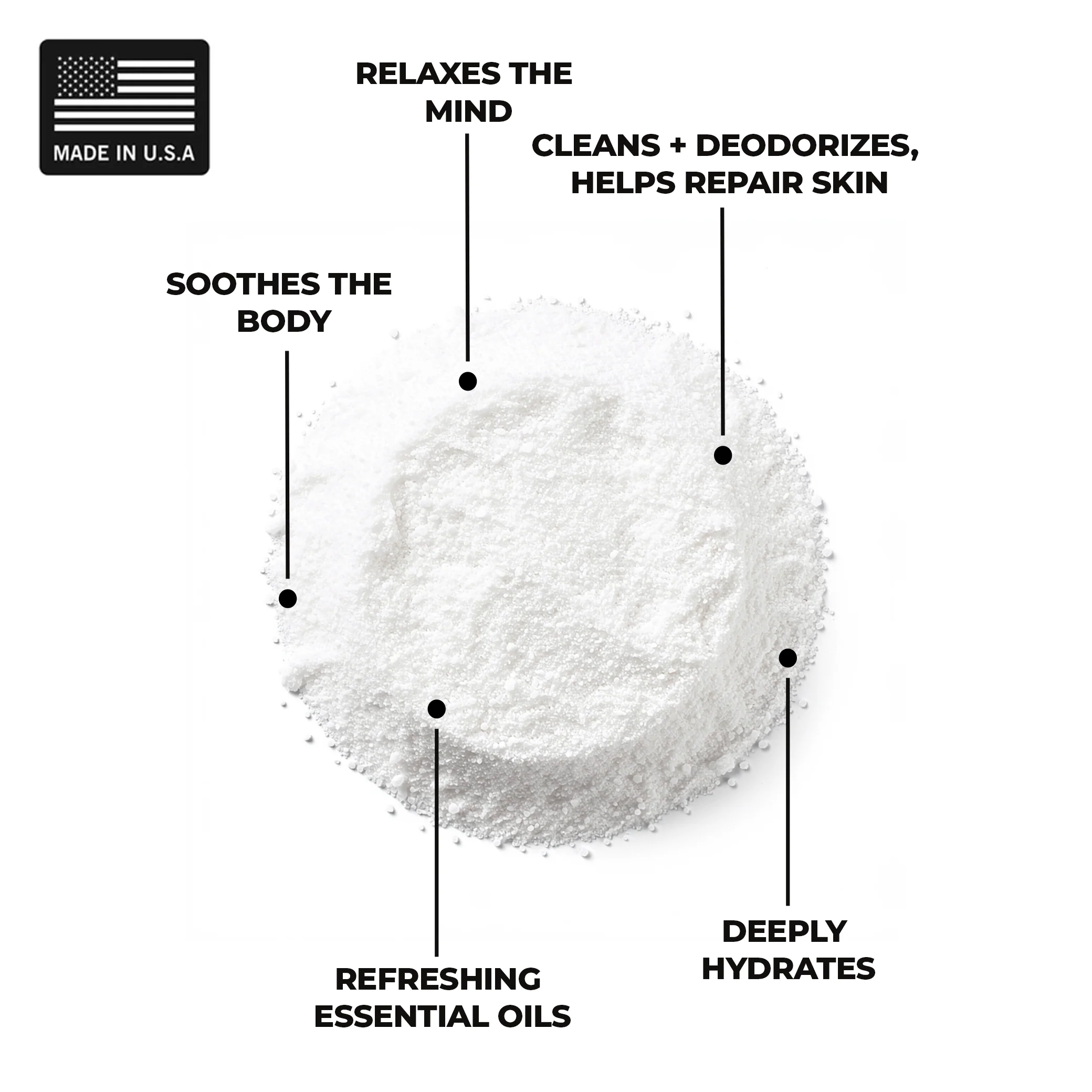 Dead Sea Salt, Sodium Bicarbonate, Citric Acid,Peppermint oil, Geranium oil, Ylang Ylang oil