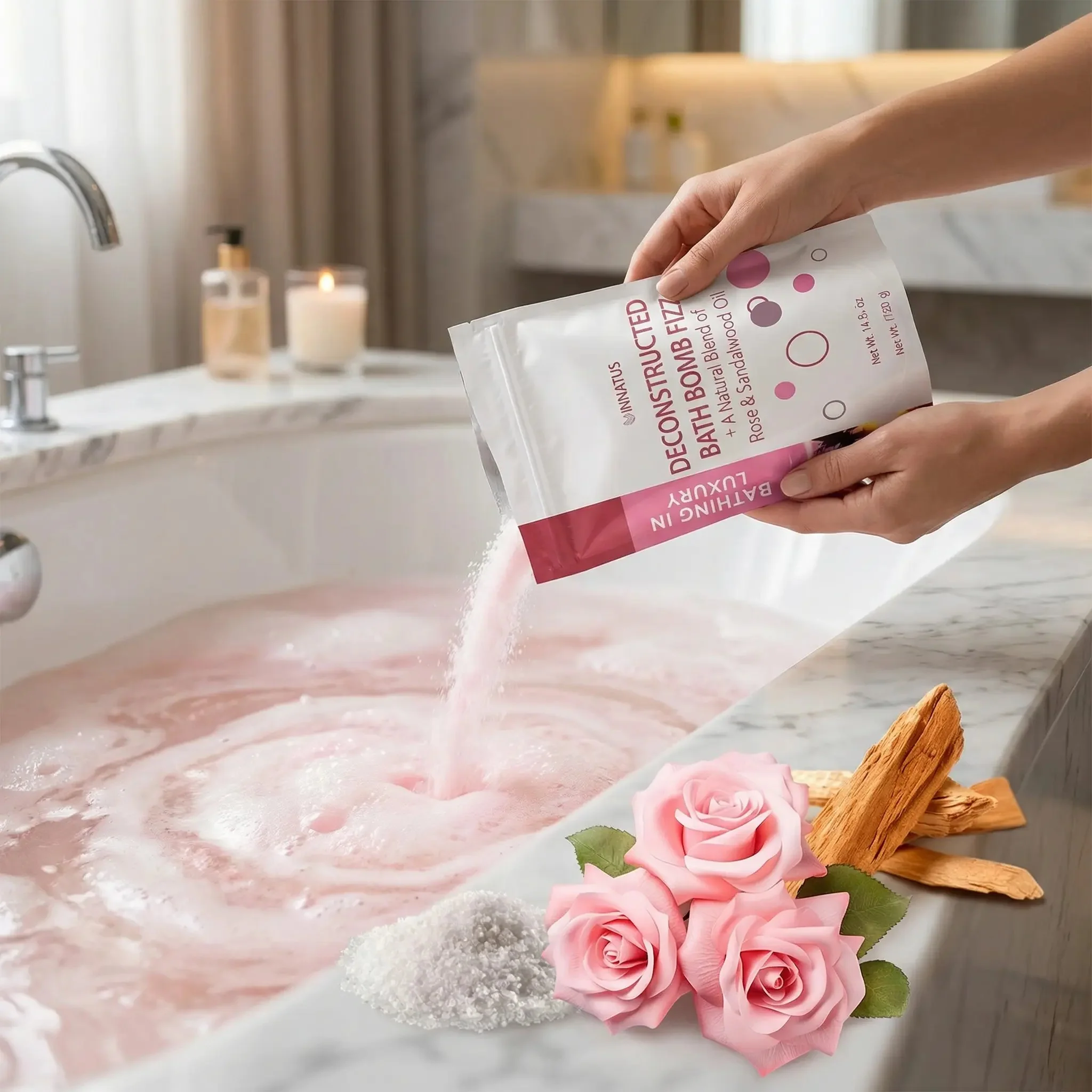 - Fill tub with warm water, sprinkle in entire contents of packet, and stir with hands to dissolve.